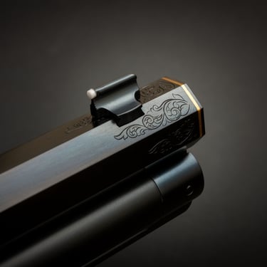 A classic, hand-crafted process used by high-end gunmakers for over a century. Each piece is carefully rusted, boiled, and polished over several days or weeks to create a rich, deep blue-black tone.